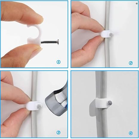 Product Details : 4 Sizes : 4mm + 6mm + 8mm +12mm // Pack of 200pcs // 4mm-50pcs, 6mm-50pcs, 8mm-50pcs, 12mm-50pcs // Cable Clips with Metal Nails Pack of 200 Cable Clips : Includes a total of 200 clips in 4 different sizes for versatile use. Effecient Cable Management : Keep your cables organized and tidy with Hi-PLASST Wire Clips. Easy Installation : Simply hammer into the wall or wooden surfaces to keep cables in place for quick and hassle-free installation. Sturdy Metal Nails : These U-Shaped clips comes with durable metal nails for secure and long-lasting cable management. Multi-Purpose Use : Hi-PLASST wire holder clips for wall are suitable for managing cables of various sizes and types, including power cords, USB cables, dish Tv and ethernet cables. Ideal for organizing electrical wires, LAN cables, TV cables, and more. Neat Appearance : The white color of the Wire Clip // Wall Pin blends seamlessly with any decor, providing a clean and organized look. Pack of 200 : Each pack includes 200 cable clips, ensuring you have enough to tackle all your cable management needs.